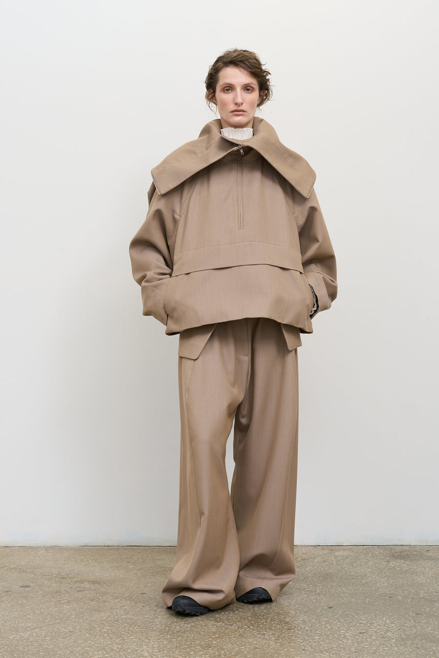 The LITKOVSKA His for Her Jacket in Beige blends bold tailoring with soft details. Handmade in Ukraine, it’s crafted from 100% virgin wool with a smooth 100% viscose lining and sleeve lining for all-day comfort. The cinched belt creates a defined silhouette, balancing its relaxed, unisex-inspired cut. Perfect with trousers or skirts, this jacket reflects LITKOVSKA’s knack for modern Ukrainian craftsmanship.